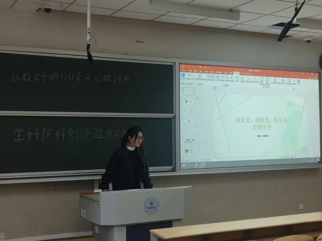 第七届“互联网+”大学生创新创业大赛金奖。她结合在校期间丰富的科创经历,以时间为线索,详细讲解了联系指导教师、选定研究方向、参观各实验基地、打磨项目内容的经验以及比赛时的答辩技巧。此外,她还介绍了自己考取山东省拔尖选调生,回到家乡担任村书记的助理的经历,并鼓励学弟学妹们扎根基层沃土,奉献自我,以实际行动实现当代大学生的青春价值。