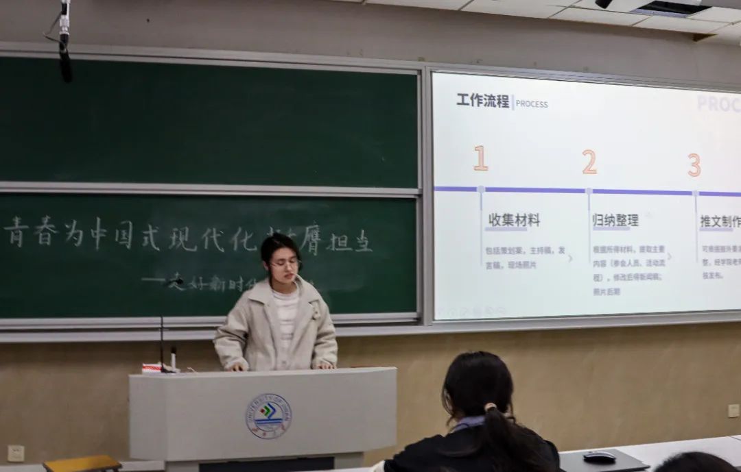 会议上,首先由团务部成员进行了思想政治引领工作培训,从党史与国史学习、主题团课的形式与方法、强化纪律意识等方面进行了讲解,之后进行了组织建设工作培训,介绍了关于召开团会、如何转接团关系等内容。最后,团务部成员对学生干部进行了宣传工作方面的培训,并由文宣工作站负责人讲解了照片的注意事项和文稿的相关要求。