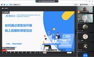 为提升教学水平和质量,全面提高教师利用信息技术开展过程性教学和创新教育教学的能力,深入开展线上线下融合式教学,学院于2022年2月24日组织学院老师并邀请课堂派平台讲师开展“如何通过课堂派开展线上直播和课堂互动”的培训。