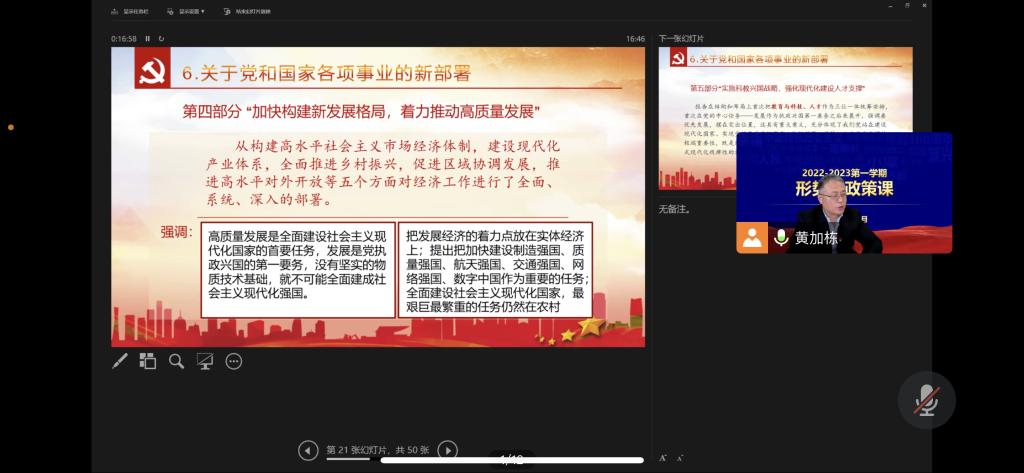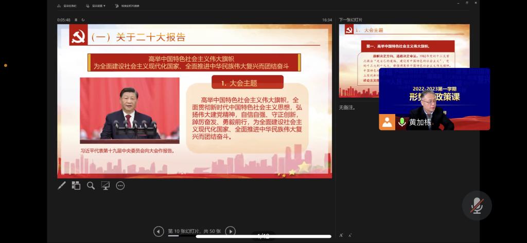 黄加栋副校长在讲授时谈到,党的二十大报告中的三个板块和十五个部分是有机统一的整体,导语和前三部分构成第一板块,包含成就经验、指导思想、使命任务。第四至第十五部分构成第二板块,对各领域做出战略部署。结语构成第三板块,号召全党、寄语青年。三大板块从战略使命任务到各领域工作策略部署,有机统一。必须全面、准确、深入理解内涵,精准把握外延。他强调,党的二十大报告首次把教育、科技、人才三位一体统筹安排,教育支撑科技发展,人才支撑创新,创新带动经济和文明,既是理论和实践上的创新,又赋予了教育在现代化建设中新的属性、要求和使命。党的二十大报告博大精深、内涵丰富,是党和人民智慧的结晶,是党团结带领全国各族人民夺取中国特色社会主义新胜利的政治宣言和行动纲领,是马克思主义的纲领性文献,今后要努力做到学用结合,将党的二十大精神真正融入到学习生活中去。