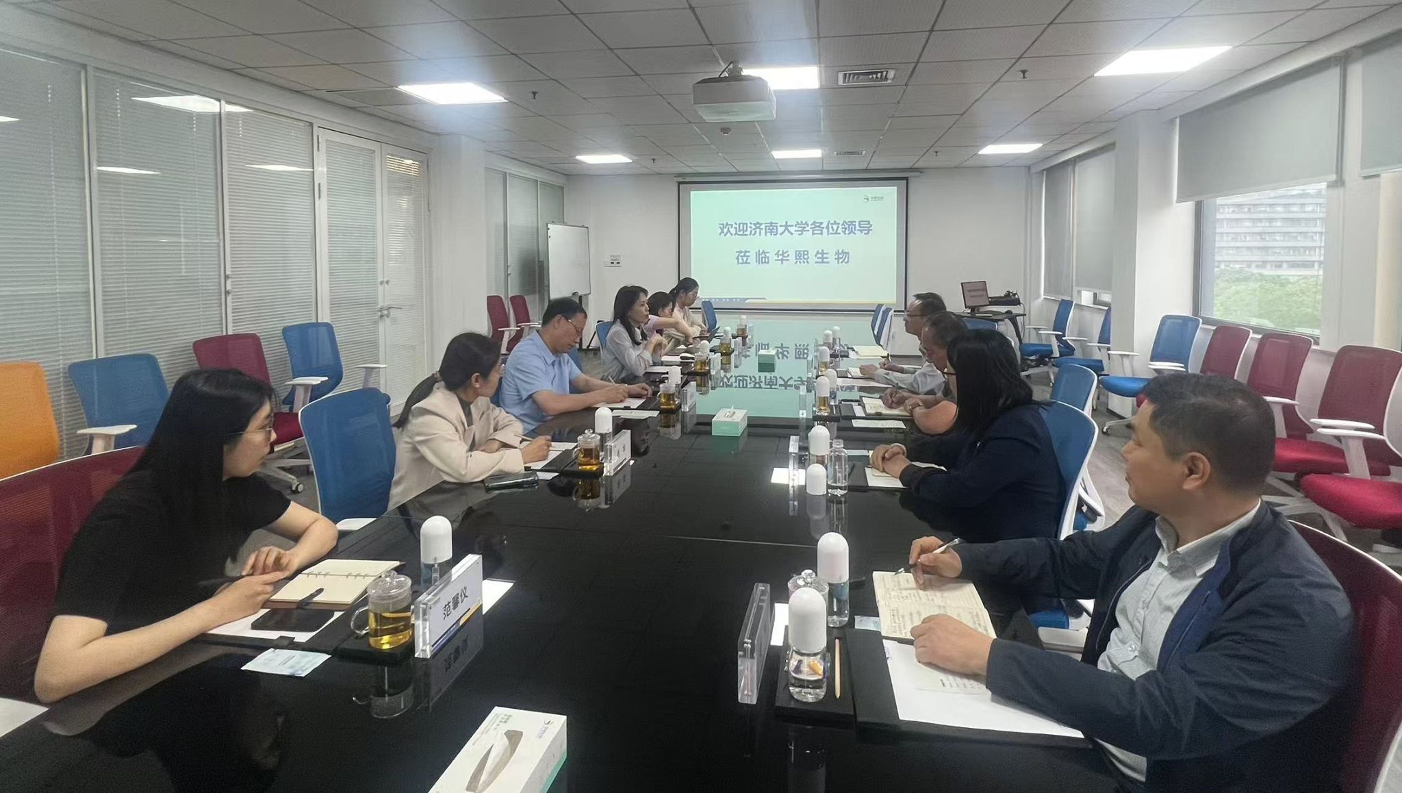 华熙生物科技股份有限公司党委书记尹延箫对学院一行的到访表示热烈欢迎,希望双方充分发挥各自优势,共同开展产学研合作,同时,探索开展学生工业研学项目、校外导师聘任、合作科研等工作机制,密切交流。济南生产基地厂长仲崇利详细介绍公司的发展现状、未来规划等情况;研发平台及对外事务管理总监黄思玲介绍了公司研发相关情况;人力资源中心经理丁娟娟介绍了公司人才需求、员工管理与培训等相关情况。